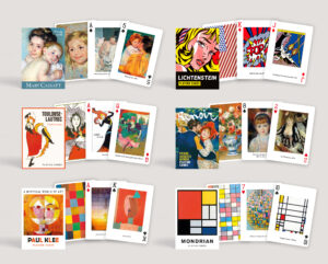 Dieter Strehl, the Austrian head of Piatnik, the venerable Viennese games company, saw the originals in a gallery window and wanted to produce the pack. He did. It sold very well and created a nice furore in the media, upsetting Buckingham Palace, who demanded the pack be banned. ‘Fergie’, the Duchess of York, thought her portrait made her look crass.From this irreverent start, we have become a publisher of collectable cards (about 150 packs to date – SEE BELOW) that appeal to all brows, both high and low. From the sublime (Leonardo) to the ridiculous (Straight Flush – ‘A light-hearted celebration of vintage water closets, chamber pots… and all things lavatorial’). Some are huge sellers (Banksy, Van Gogh, Monet…) and some are more niche. Subjects include film, music, art, history, fashion, sport… and humour.