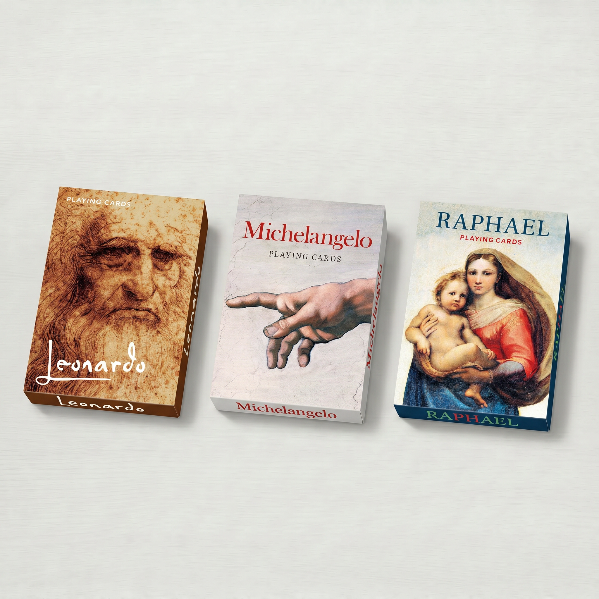 Each deck focuses on a single artist, allowing their work to be seen in detail. Leonardo moves between observation, engineering and invention, constantly testing the boundaries of form and knowledge. Michelangelo works with force and intensity, shaping bodies that feel driven by physical and emotional pressure. Raphael builds order and clarity, producing compositions defined by balance and structure.